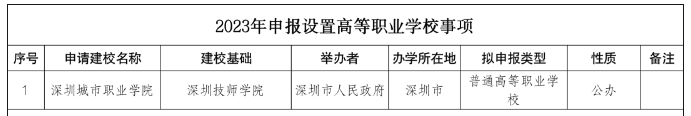 此前,廣東省教育廳發(fā)布《關(guān)于2023年度申報(bào)設(shè)置高等職業(yè)學(xué)校事項(xiàng)的公示》,申報(bào)以深圳技師學(xué)院為基礎(chǔ)設(shè)立深圳城市職業(yè)學(xué)院。