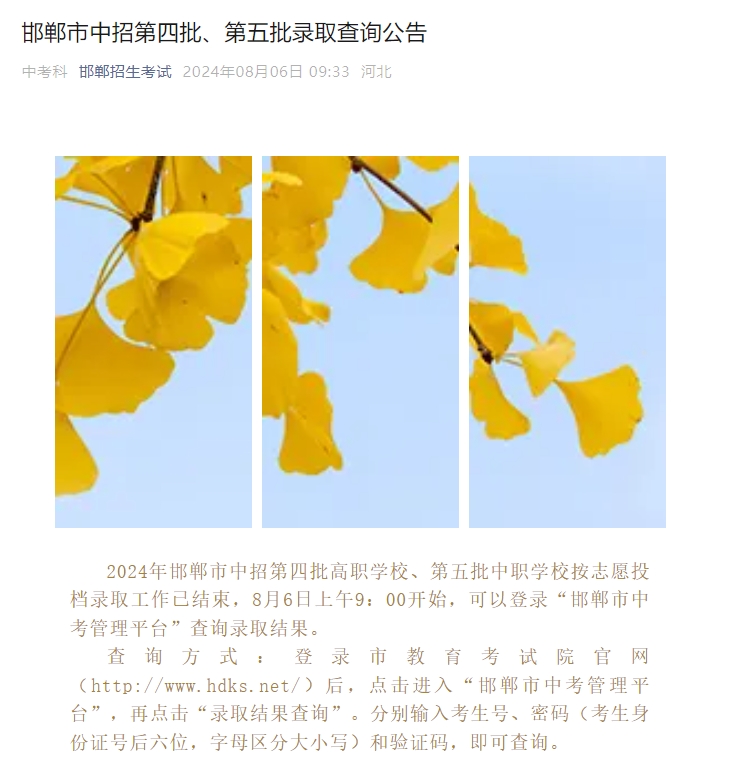 2024年邯鄲市中招第四批高職學(xué)校、第五批中職學(xué)校按志愿投檔錄取工作已結(jié)束,8月6日上午9:00開始,可以登錄“邯鄲市中考管理平臺”查詢錄