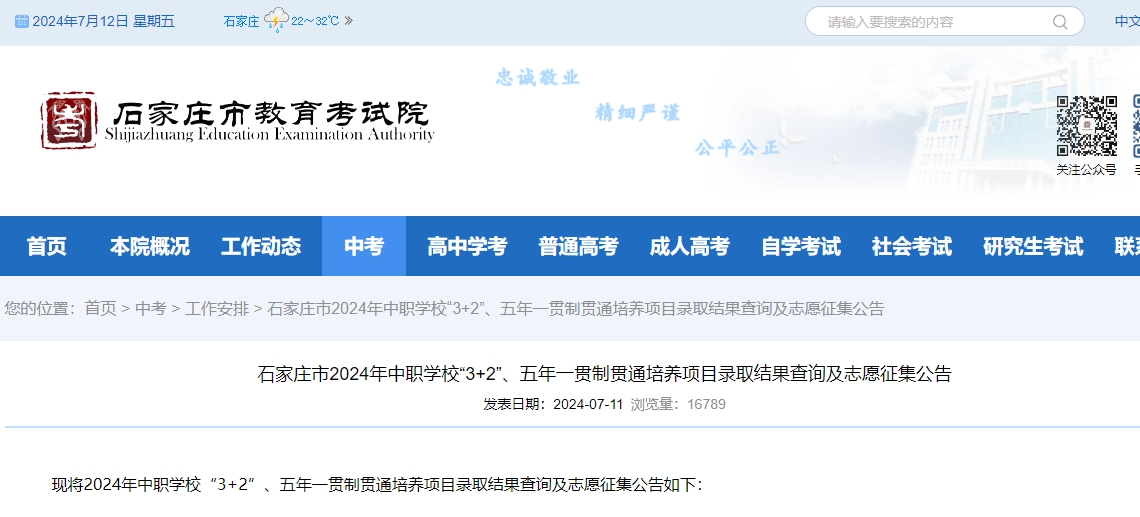 石家莊市2024年中職學(xué)?!?+2”、五年一貫制貫通培養(yǎng)項(xiàng)目錄取結(jié)果查詢及志愿征集公告