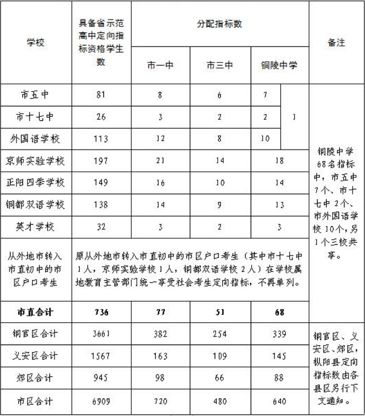 必看!2024年銅陵中考定向指標(biāo)分配表(市一中、市三中、銅陵中學(xué))