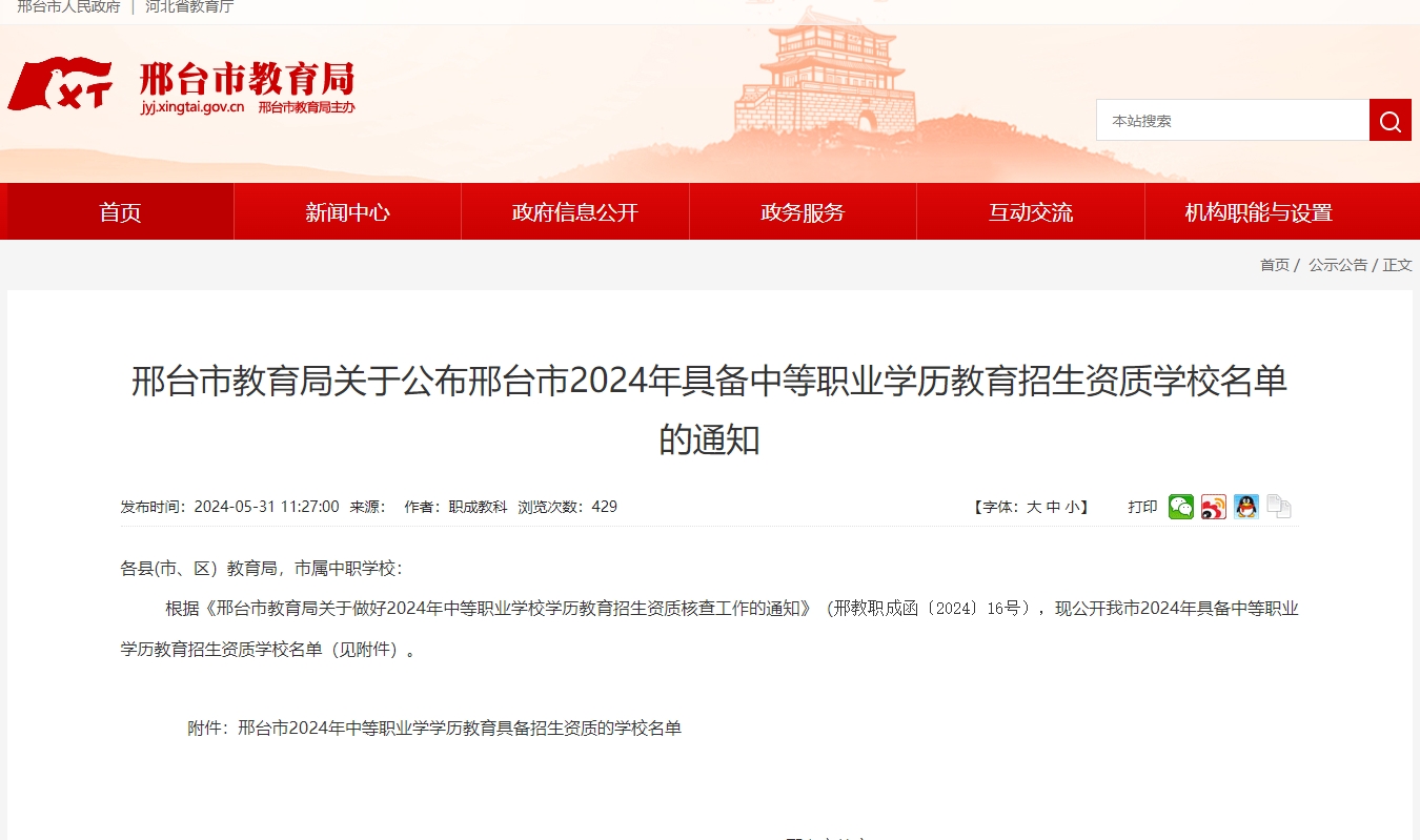 速看!邢臺市教育局關(guān)于公布邢臺市2024年具備中等職業(yè)學(xué)歷教育招生資質(zhì)學(xué)校名單的通知