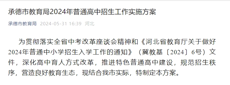 初升高必看!承德市教育局2024年普通高中招生工作實(shí)施方案公布!