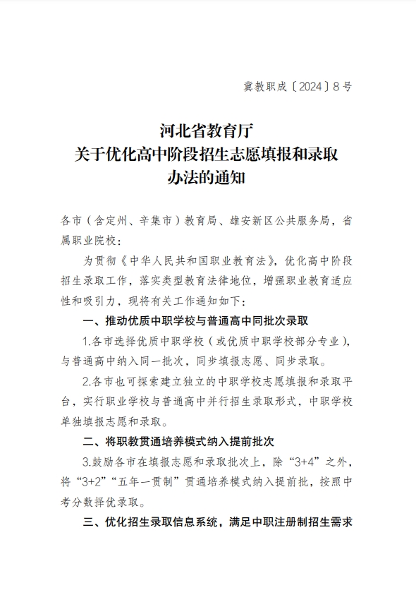 中職生注意!河北省教育廳關(guān)于優(yōu)化高中階段招生志愿填報(bào)和錄取辦法的通知公布!
