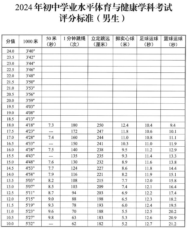 2024年馬鞍山中考體育評分標準公布