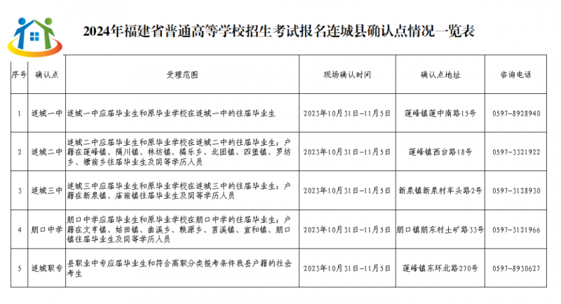 六、2024年福建省普通高等學校招生考試報名連城縣確認點一覽表