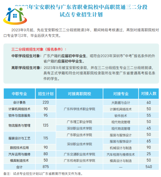 三二分段 ——學(xué)校相關(guān)專(zhuān)業(yè)與廣東省部分高職院校開(kāi)展中高職“3+2”對(duì)口直升,即在寶安職校就讀3年,經(jīng)考試合格,升入高職院校就讀2年。