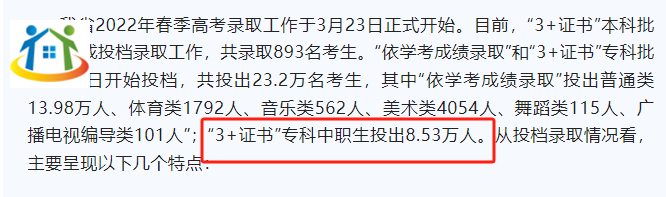 根據(jù)最新2023年“3+證書(shū)”一分一段表,今年最高分為421分,400分以上的同學(xué)今年只有10個(gè),這一分?jǐn)?shù)層次可以說(shuō)是閉著眼睛挑學(xué)校的存在!而在往下,2023年300分以上9391人,250分以上29780人!對(duì)比2022年400分以上137人,300分以上11559人。今年中高分?jǐn)?shù)段可以說(shuō)大大減少,而相對(duì)應(yīng)的今年壓力就來(lái)到了中低分?jǐn)?shù)段的考生身上了!